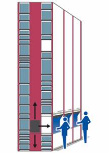 - solo sulle scaffalature esterne se si utilizzano corsie differenziate, ovvero più larghe dove manovrano i carrelli e più strette dove operano i pickers, sistema che permette ai rifornitori ed ai preparatori non intralciarsi mai e quindi effettuare gli abbassamenti delle scorte contemporaneamente al picking.